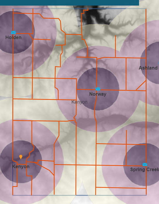 The project involved historical research of the USGS quadrangle encompassing Kenyon, MN. My intent was to create a series of deep maps to portray peoples’ attitudes toward movement and distance through the space in different period in the quadrangle’s early settlement history. The project involved using a variety of sources to go beyond the elements traditionally recorded on cartographic maps.
